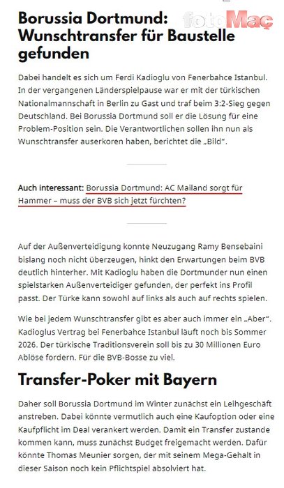 BONSERVİSİ 30 MİLYON EURO!Alman basınından derwesten’de yer alan habere göre; Fenerbahçe, başarılı sol bek için 30 milyon euro’luk bir bonservis talep ediyor.SATIN ALMA OPSİYONLU TEKLİF!Ferdi Kadıoğlu’nu kadrosuna katma konusunda ısrarcı olan Dortmund’un satın alma opsiyonlu teklif hazırlığında olduğu belirtildi.Transfer için kaynak yaratmak isteyen Alman ekibinin yüksek maaş alan isimlerden biri olan Thomas Meunier ile yolları ayırmayı planladığı kaydedildi.