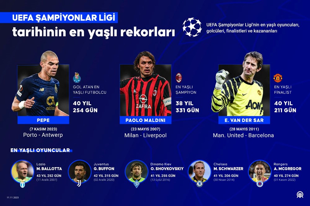 UEFA Şampiyonlar Ligi’nin en yaşlı oyuncuları, golcüleri ve finalistleri 40 yaş sınırını aştı. Portekizli savunma oyuncusu Pepe’nin (40) geçen salı günü Porto’nun evinde Antwerp ile yaptığı maçta fileleri havalandırarak UEFA Şampiyonlar Ligi tarihinin gol atan en yaşlı futbolcusu olması, Devler Ligi’nin en yaşlı unvanına sahip isimlerini gündeme getirdi.