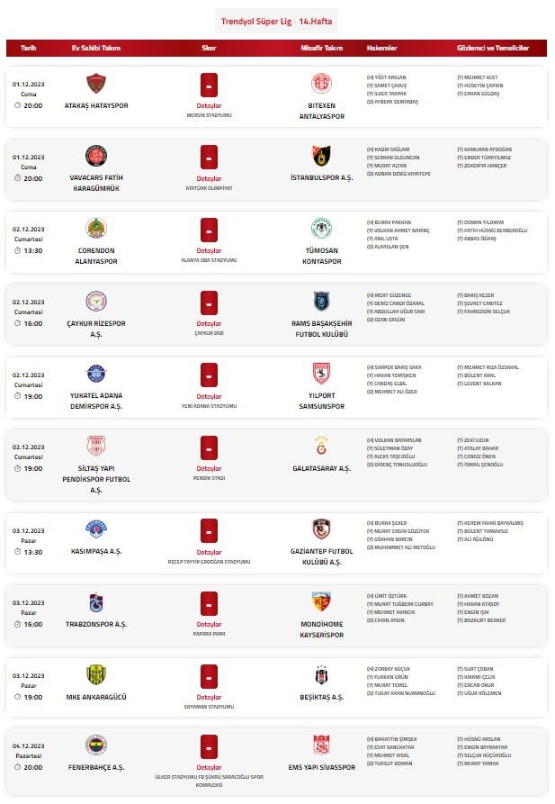 Trendyol Süper Lig’de 14. hafta maçlarını yönetecek hakemler açıklandı.DİĞERSON DAKİKA GALATASARAY HABERİ – Mauro Icardi’ye dev talip! Real Madrid “biz istemiyoruz” demiştiSon dakika: Yılın son MGK’sı Başkan Erdoğan liderliğinde toplandıGünün Spor ManşetleriTüm Manşetler